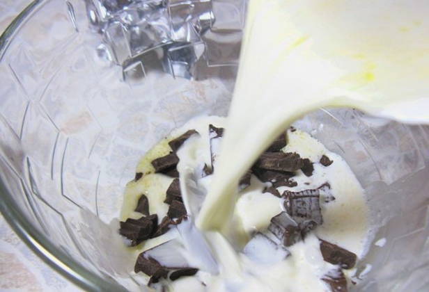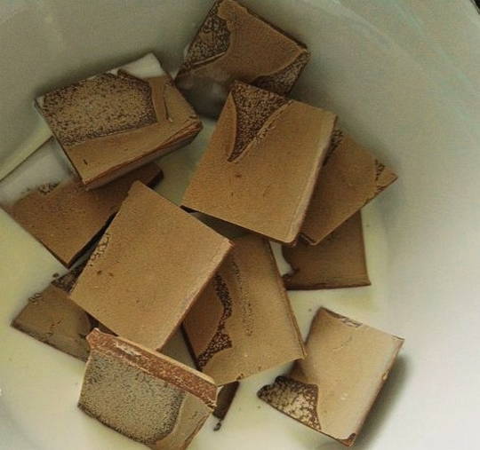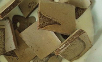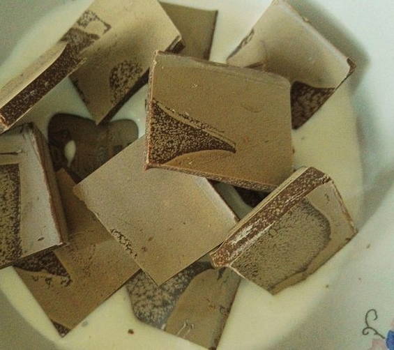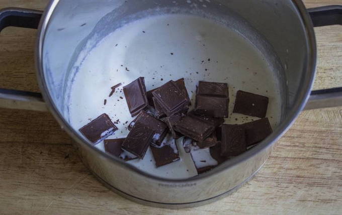 - Verwarm de room tot een temperatuur van 90 graden (het is handig om het op te warmen in een magnetron) en vul het met chocolade, in kleine stukjes gebroken. Roer lichtjes en laat 2-3 minuten staan, zodat de tegels opwarmen en smelten.