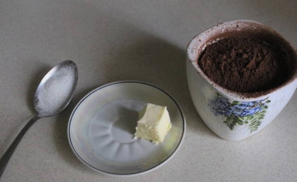 - Laten we de hoofdingrediënten klaarmaken: meet de benodigde hoeveelheid cacao, kristalsuiker af en haal eerst de boter uit de koelkast zodat deze op kamertemperatuur is.