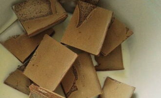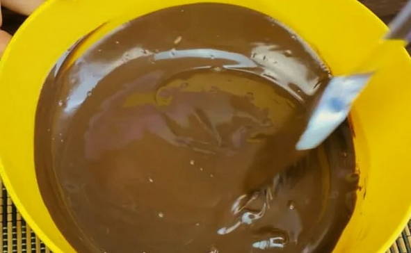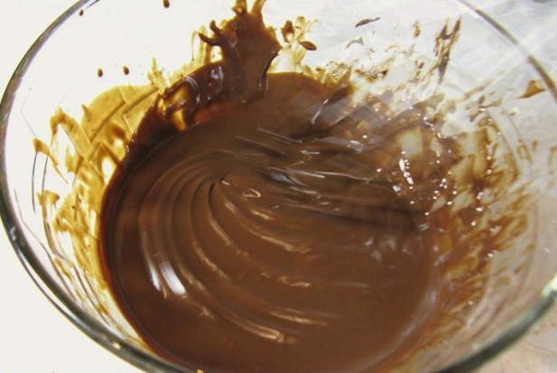 - Het proces moet beginnen met de bereiding van het hoofdingrediënt - chocolade, die trouwens kan worden vervangen door chocoladesuikergoedglazuur. Giet de gehakte chocolade in een kom van geschikte grootte en smelt in de magnetron op laag vermogen.