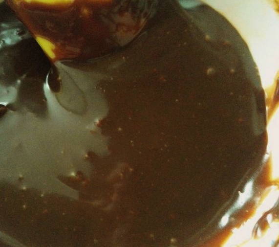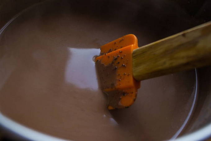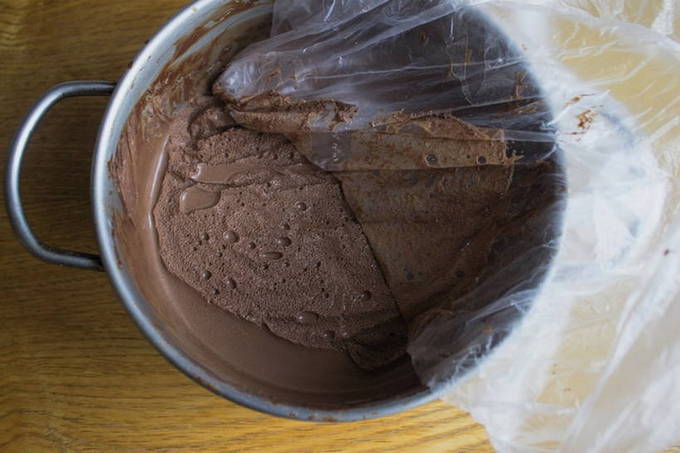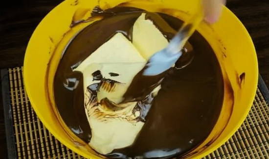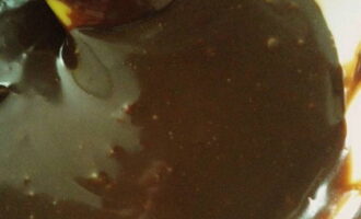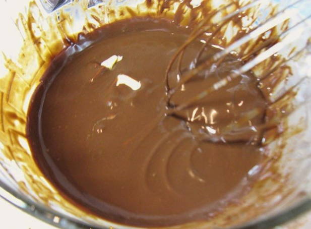 - Voeg een klein stukje boter toe aan de chocolademassa en roer tot een gladde massa. Voor aroma kun je een paar druppels cognac of likeur toevoegen.