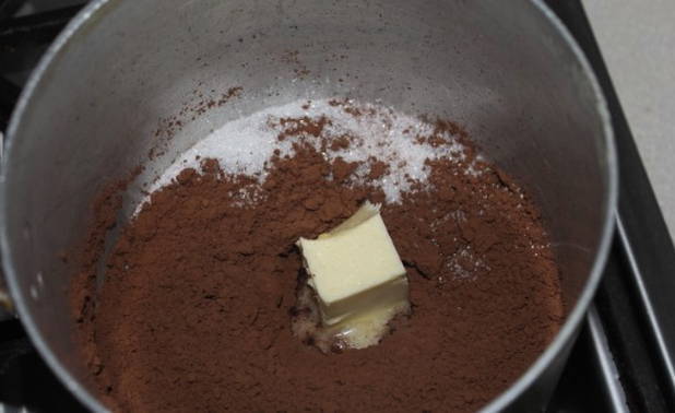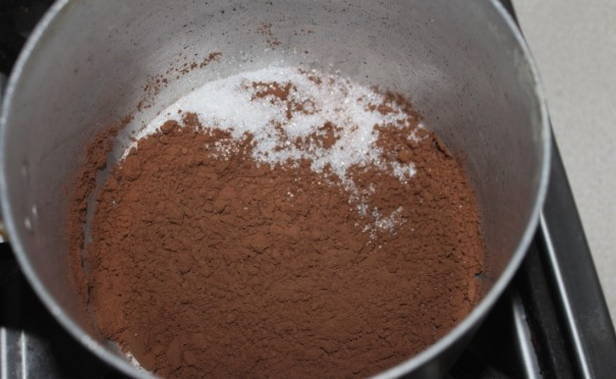 - Voeg cacaopoeder gezeefd door een fijne metalen zeef toe aan de kristalsuiker (kan worden vervangen door 70-80 gram fijn geraspte donkere chocolade).