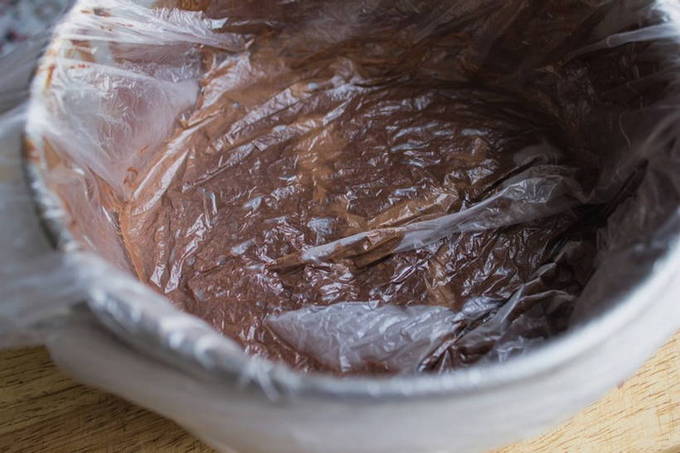 Druk het mengsel stevig aan met huishoudfolie en zet het 1,5-2 uur in de koelkast - voor volledige stolling.