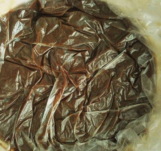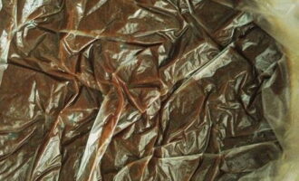 - Nadat de aangegeven tijd is verstreken, halen we de pan uit de koelkast en verwijderen we voorzichtig de huishoudfolie.