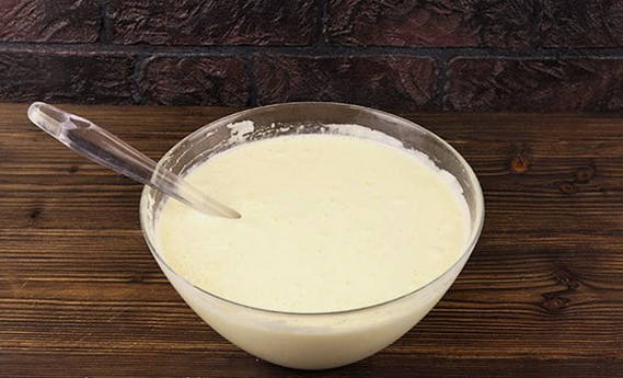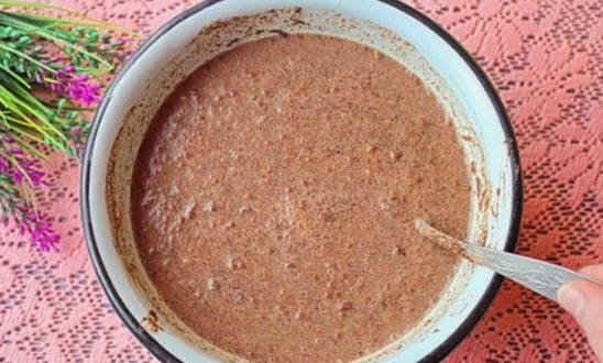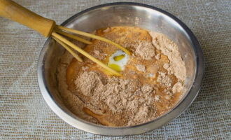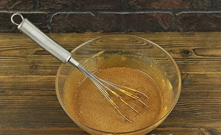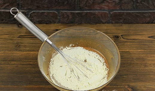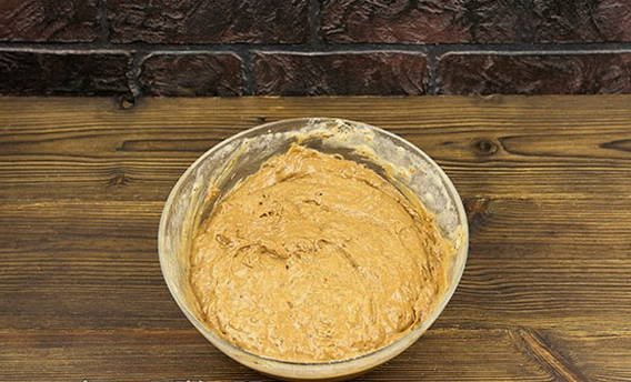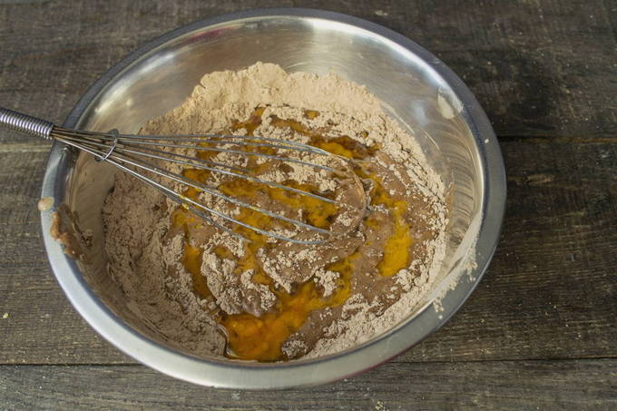 - Klop kefir apart met ei en boter. Giet het mengsel in een droge massa en meng grondig.