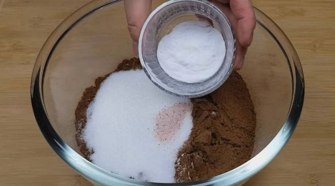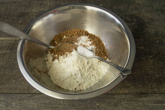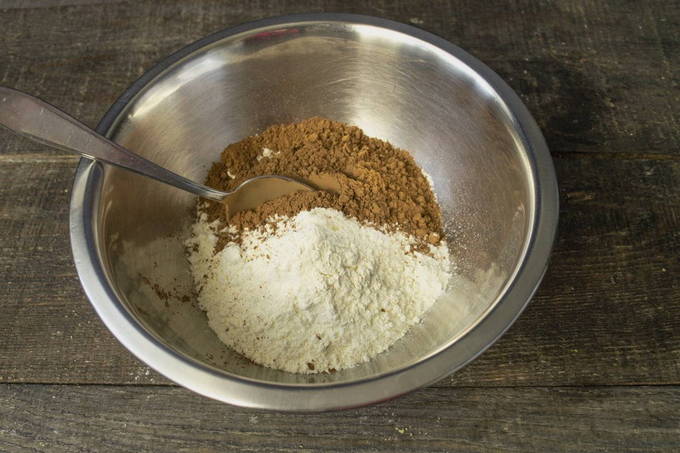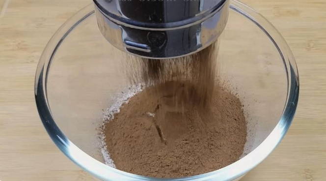- Zeef de bloem door een fijne zeef. We mengen het met bakpoeder, cacao en twee soorten suiker.