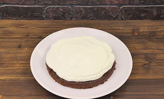 - Bedek de eerste laag van de cake met room.