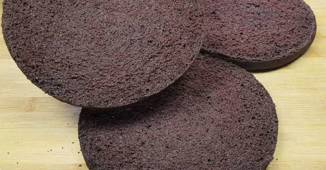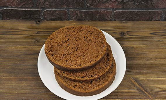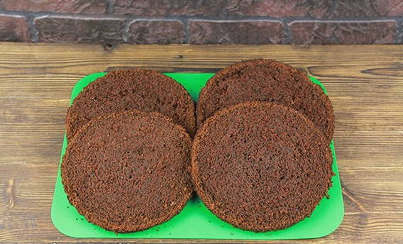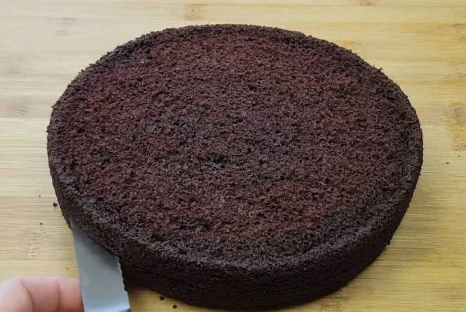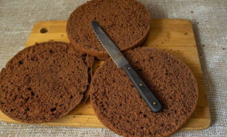 - Verdeel de gebakken goederen in drie gelijke cakes. Snijd voorzichtig de bovenkant af en laat ter decoratie.