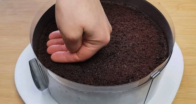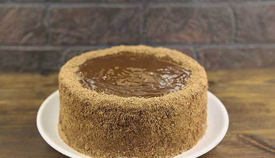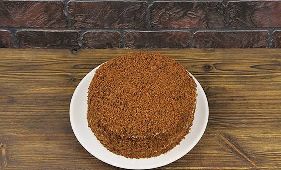 - Daarna gaan we verder met het decoreren van het dessert. Bedek de zijkanten met room. De resterende cake is verkruimeld. Lijm het resulterende product op de crème.