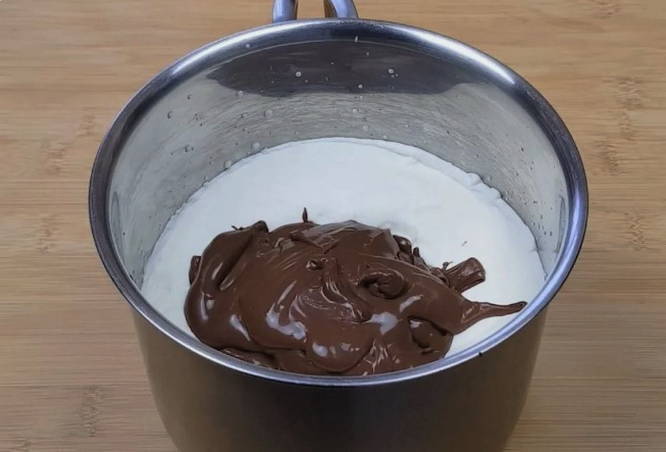 - Giet voor de room 50 ml hete room in een diepe kom. We dompelen er de geplette reep pure chocolade in. Roer de inhoud totdat de vaste stof smelt.