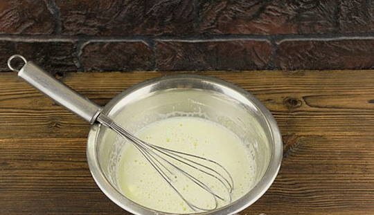 - Giet het melkmengsel in een dun straaltje bij het eiermengsel.