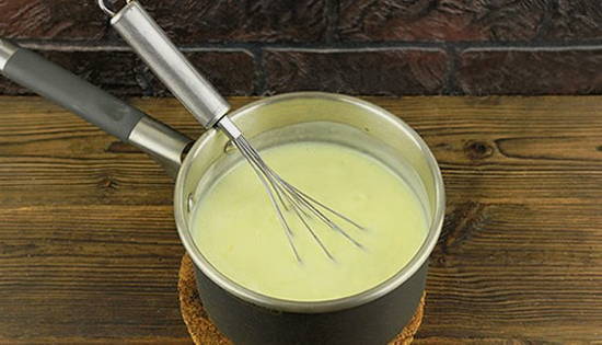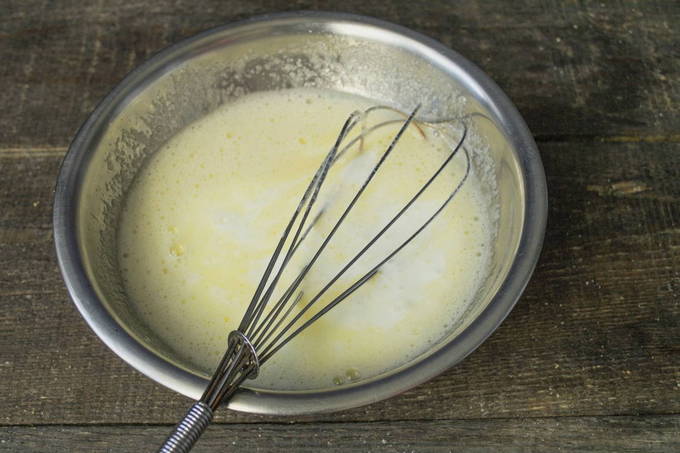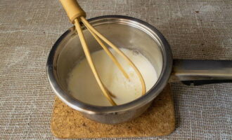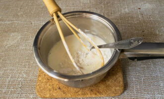 Voeg zetmeel toe aan de vloeibare massa en klop met een garde.