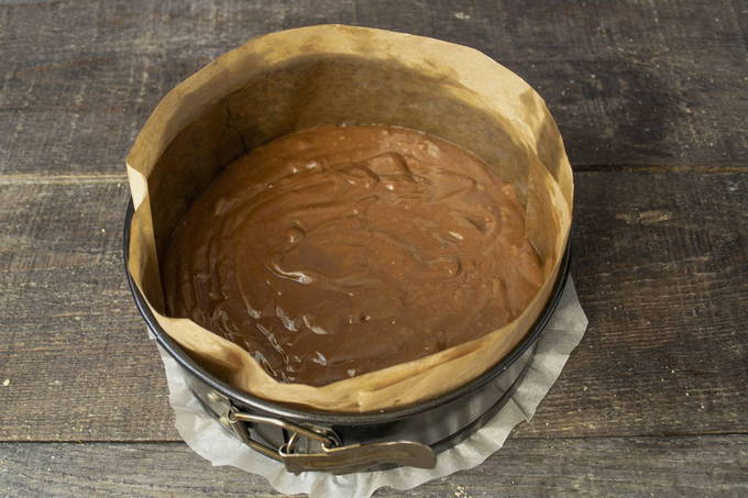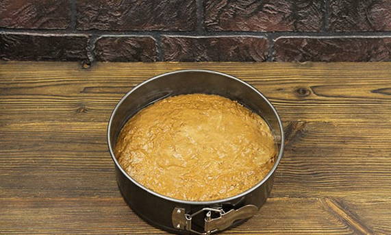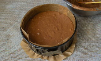 Giet het deeg in een ovenschaal. Bakken in de oven op 180 graden gedurende 1 uur.