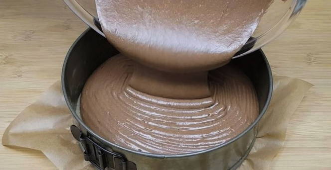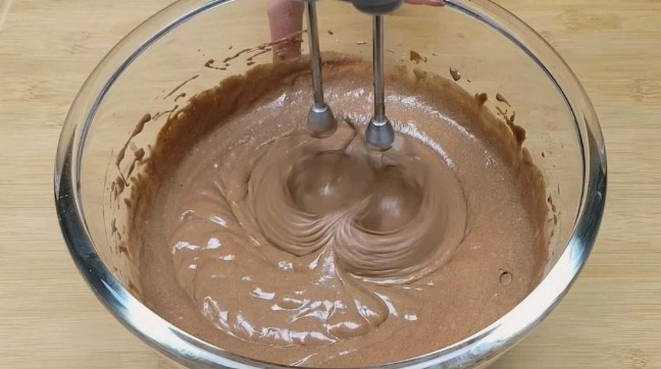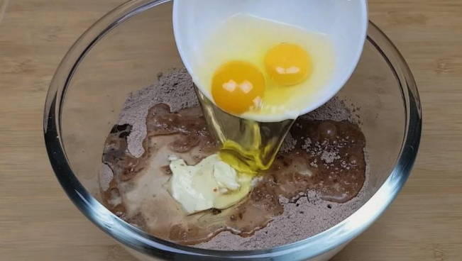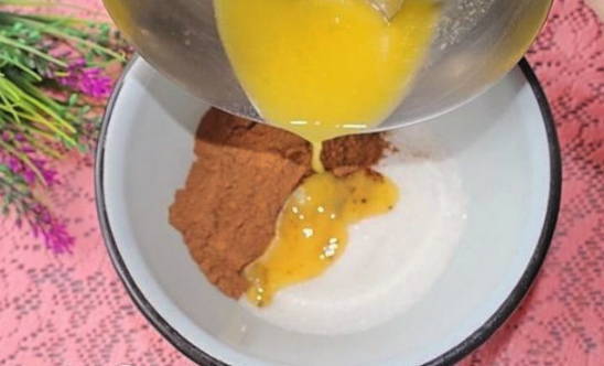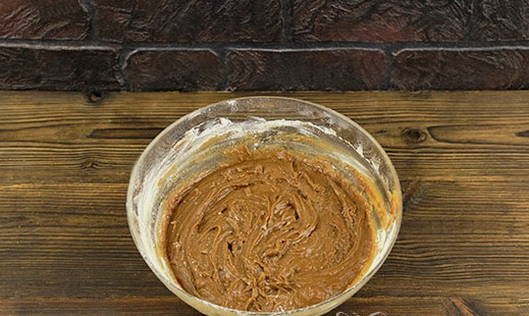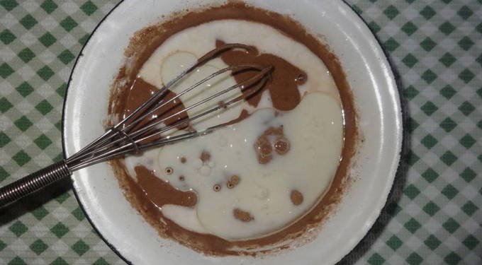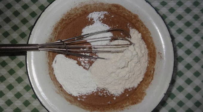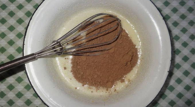 Meng bloem, suiker, cacao en soda in een diepe kom. Voeg er gesmolten boter, kippeneieren en room aan toe. Klop de ingrediënten tot een gladde massa.