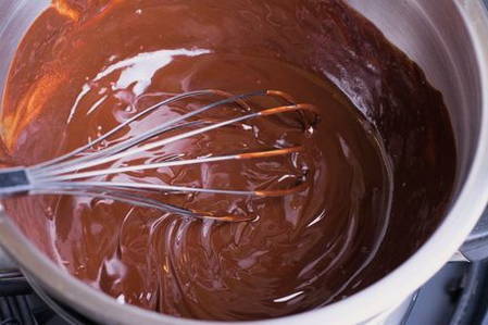 - Laten we beginnen met het maken van ganache. Los hiervoor de stukjes pure chocolade op in hete room.