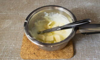 Snijd de boter in kleine stukjes. We verspreiden het product in de totale massa.