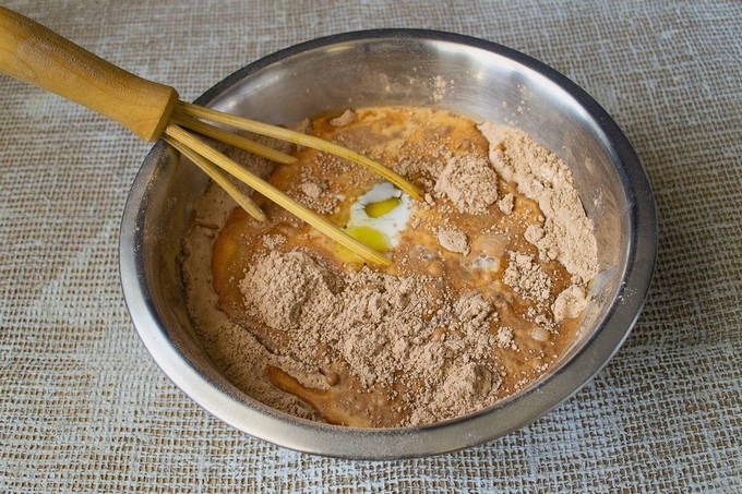 - Giet hier melk en plantaardige olie. Kneed het voedsel met een lepel of spatel.