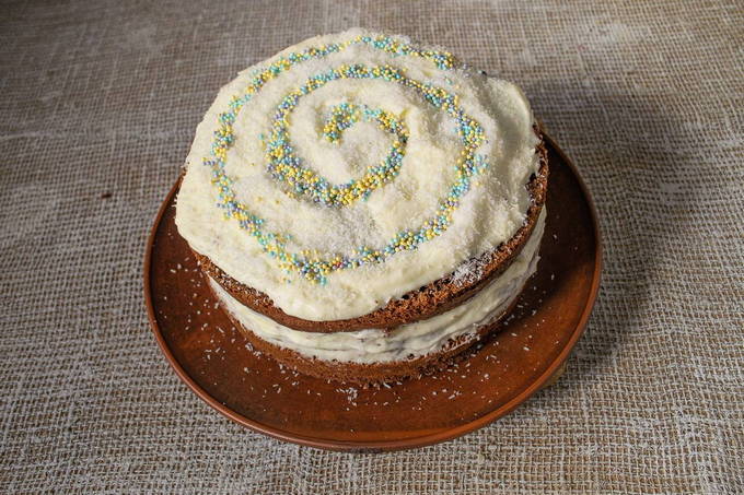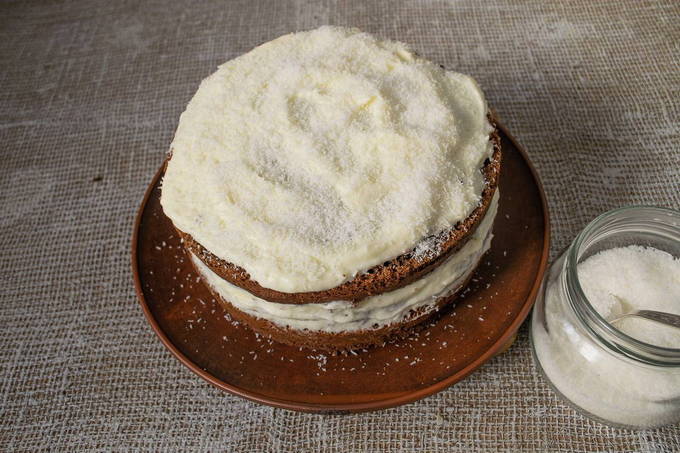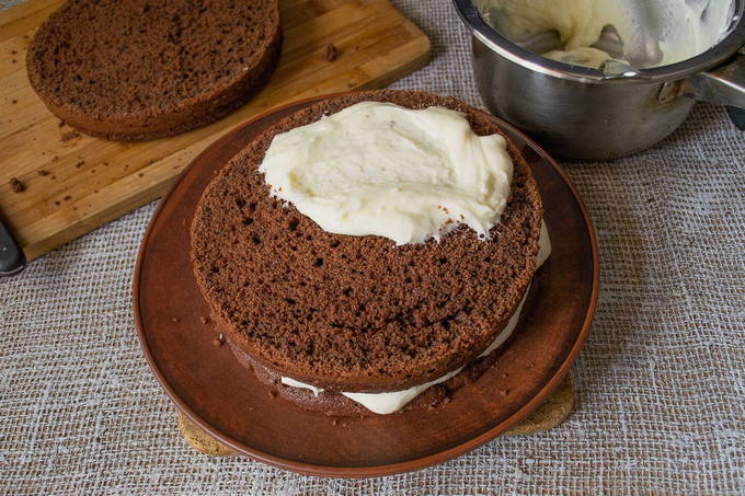 - Wij vormen de taart. We bedekken de lagen met de resulterende crème.