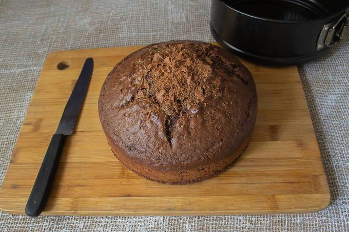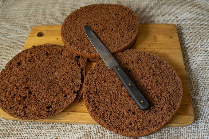 - Verdeel de gebakken goederen in drie gelijke cakes. Snijd voorzichtig de bovenkant af en laat ter decoratie.