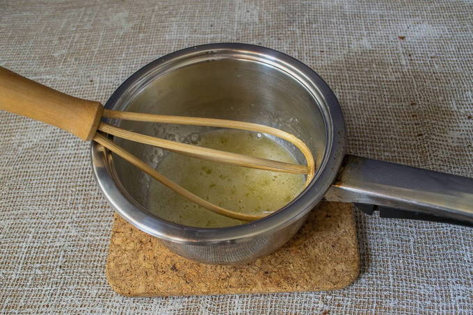 - Smelt de boter, laat afkoelen en giet het bij het eiermengsel.