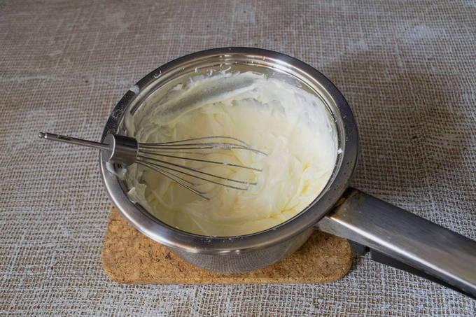 - Laten we teruggaan naar het maken van de room. Voor hem moet je de resterende 250 ml room grondig kloppen voor de room.
