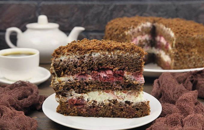 Chocoladetaart met een sappige impregnering wordt gemaakt met de toevoeging van kersen. Dessert zal u verrassen met een heldere combinatie van smaak en uiterlijk. Maak een zelfgemaakte traktatie voor een groot, gezellig theekransje.