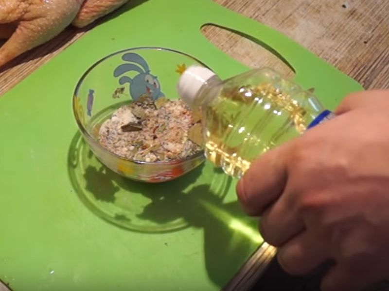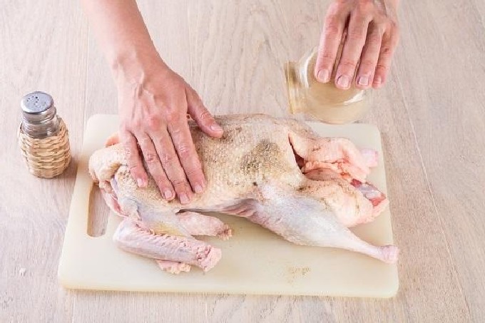- Wrijf van boven en van binnen met zout en kruiden, wrijf een beetje in het karkas zodat het beter verzadigd is met aroma's.