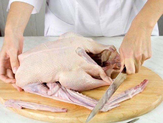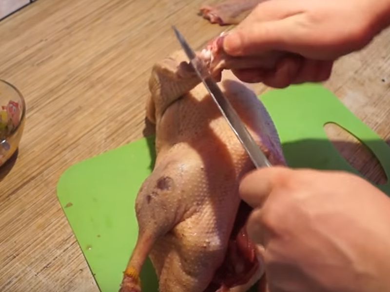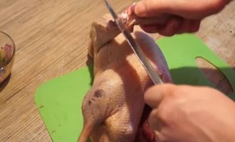 - We knijpen en reinigen het karkas, maken een incisie met een mes en verwijderen alle binnenkant er doorheen. Was en laat de gans een beetje drogen.