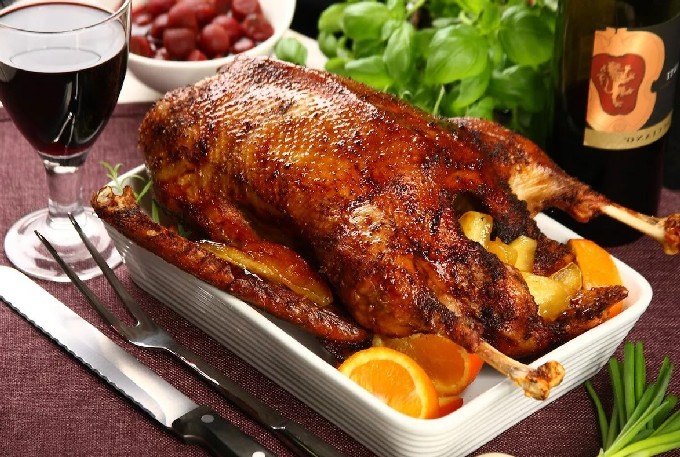 Tip: Voordat je het serveert voor schoonheid, kun je de gans versieren met fruit. Sinaasappels zien er erg indrukwekkend uit. Snijd gewoon in cirkels en bekleed de bovenkant ermee.