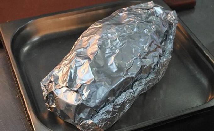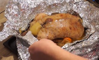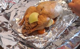- Nu leggen we de gans op de folie en wikkelen deze erin. Leg op een bakplaat en plaats in een hete oven gedurende 60 minuten. Als de tijd om is, halen we de gans eruit en snijden we de folie, plaatsen deze terug om de bovenkant bruin te maken en een knapperige korst te krijgen. We bakken nog 20 minuten.
