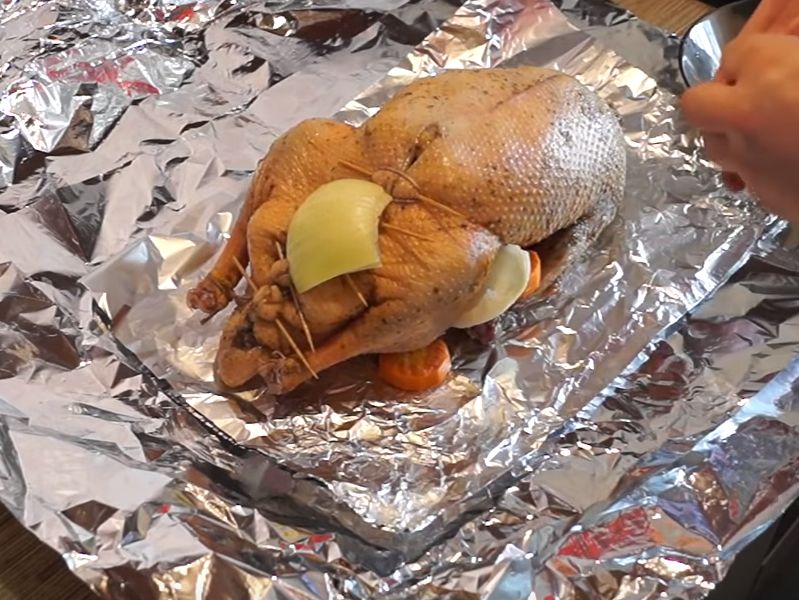Nu gaan we onze gans in folie wikkelen. Voor de smaak kun je er plakjes ui en wortel in doen.