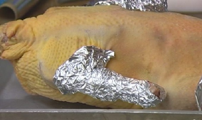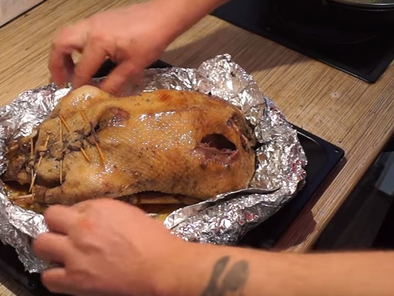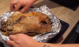 - Nu wikkelen we het in folie en op een bakplaat sturen we het 1,5 uur naar een voorverwarmde oven. Daarna snijden we de folie en bakken de gans nog een half uur.