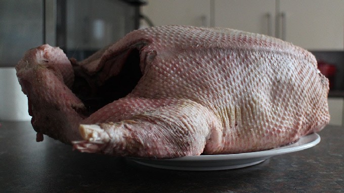 - Schil de huid van de gans, spoel het karkas goed af en reinig de binnenkant van het hart, de lever, de longen. Snijd de vleugels en keel af.