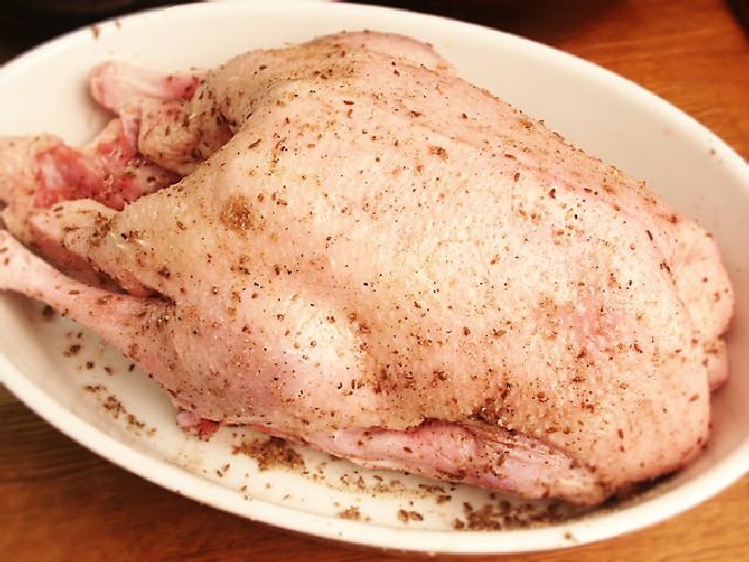 - We wrijven het ganzenkarkas in met kruiden, om het gemakkelijker te maken, kun je ze mengen met een lepel plantaardige olie.