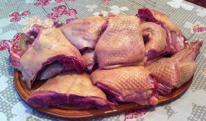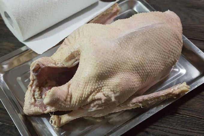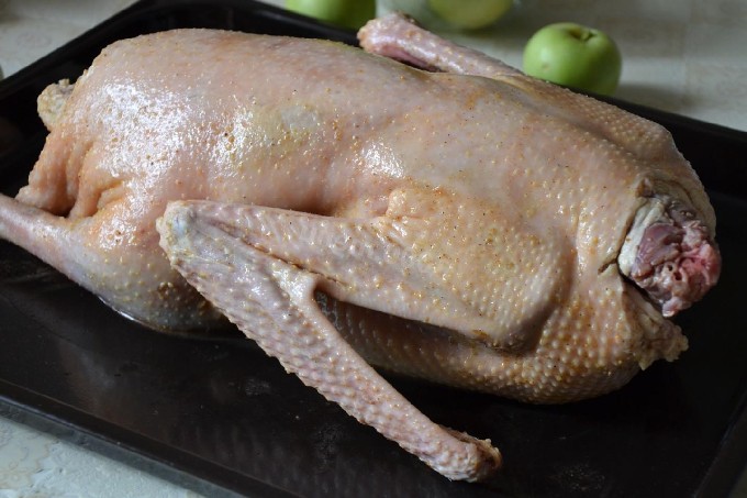 - We wassen de gans onder stromend water en laten hem een paar minuten drogen. Maak de binnenkant schoon, verwijder het vet.