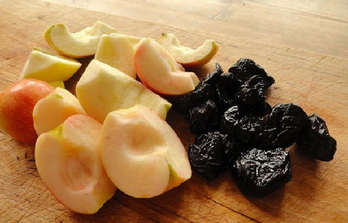 - We wassen en drogen de pruimen. We mengen het met appels.