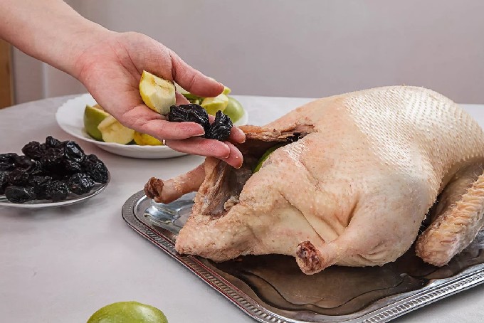 - We vullen het ganzenkarkas met appels en pruimen. We verbinden het karkas met draden en tandenstokers. Smeer de bovenkant in met plantaardige olie, zodat deze bij het bakken rossig wordt met een knapperige korst.