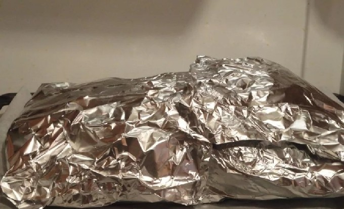 - We leggen een bakhuls op een bakplaat en leggen het ganzenkarkas erop, nu wikkelen we het in een hoes.