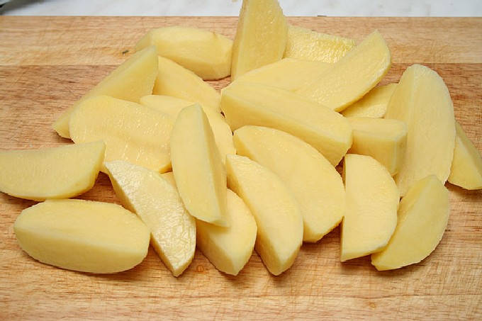 - Laten we nu de aardappelen schillen. En snijd het in plakjes. Zout en peper. Voeg laurierblaadjes toe aan de aardappelen.