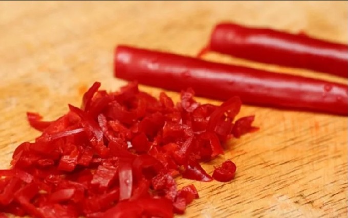 De eerste stap is om de marinade klaar te maken voor het bakken. Om dit te doen, plet u piment en giet het in een bord.