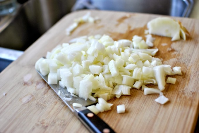 - Pel de ui en snij in kleine blokjes.