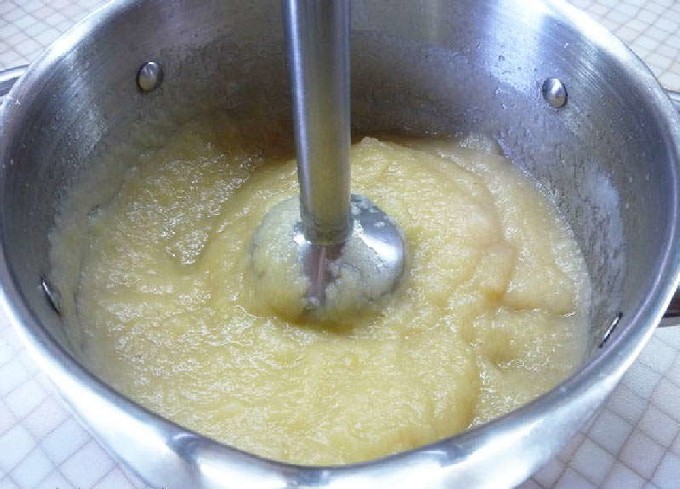 - Schil een appel. Snijd het in stukjes en snij het midden uit met zaadjes.Maal nu in een blender.