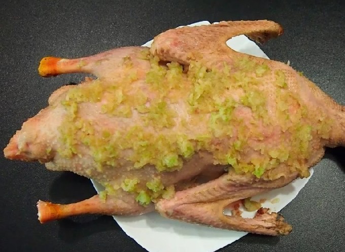 - We maken de gans schoon, verwijderen het vet van binnenuit, spoelen hem af en laten hem drogen. Wrijf het vervolgens goed in met het voorbereide mengsel. En laat 6-8 uur opstijven in de koelkast.