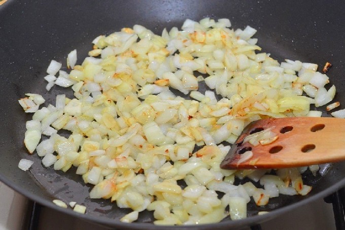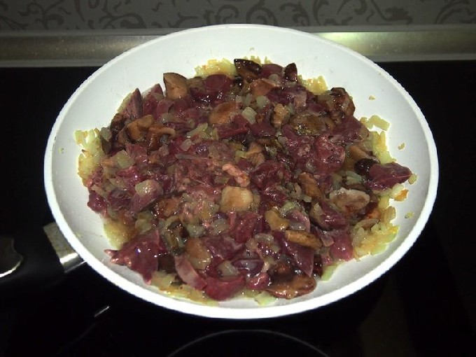 - Pel de ui en snij in kleine stukjes. Bak ze vervolgens in een pan. Voeg er champignons en lever aan toe.