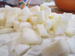 Schil, snijd en voeg de appel toe aan het vlees.