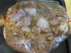Giet zure room met marinade in de sleeve, maak de tweede clip stevig vast en meng de inhoud van de sleeve voorzichtig om het vlees en de saus gelijkmatig te verdelen. Leg de sleeve op een bakplaat en bak het vlees 1 uur en 15 minuten in de oven op 180°C.