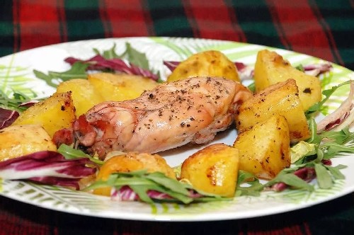 Konijn met aardappelen in de oven is een zeer smakelijk gerecht waarbij het vlees goudbruin en zacht wordt en de aardappelen zeer aromatisch zijn. Bak vlees en groenten niet voor het bakken. Het recept is eenvoudig en snel.