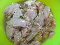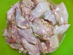 - Snijd het konijnenkarkas in losse stukken en leg ze in de marinade en meng goed.