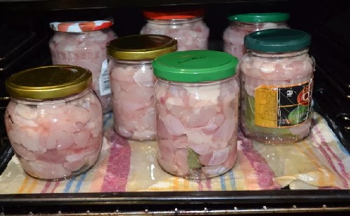 - Bedek een brede pan voor sterilisatie met een handdoek en plaats alle potten met vlees erin en bedek ze met deksels.