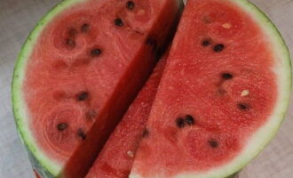 - Spoel de schil van de watermeloen grondig af met zuiveringszout. U kunt een borstel of spons gebruiken. Snijd het product vervolgens in driehoeken.