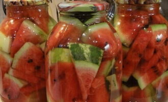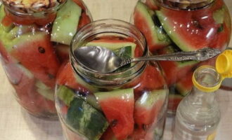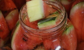 - Plaats de stukjes watermeloen stevig in glazen potten. Vul ze met een hete marinade van water, suiker, zout en azijn. We sluiten de blanco's onmiddellijk af met metalen deksels.